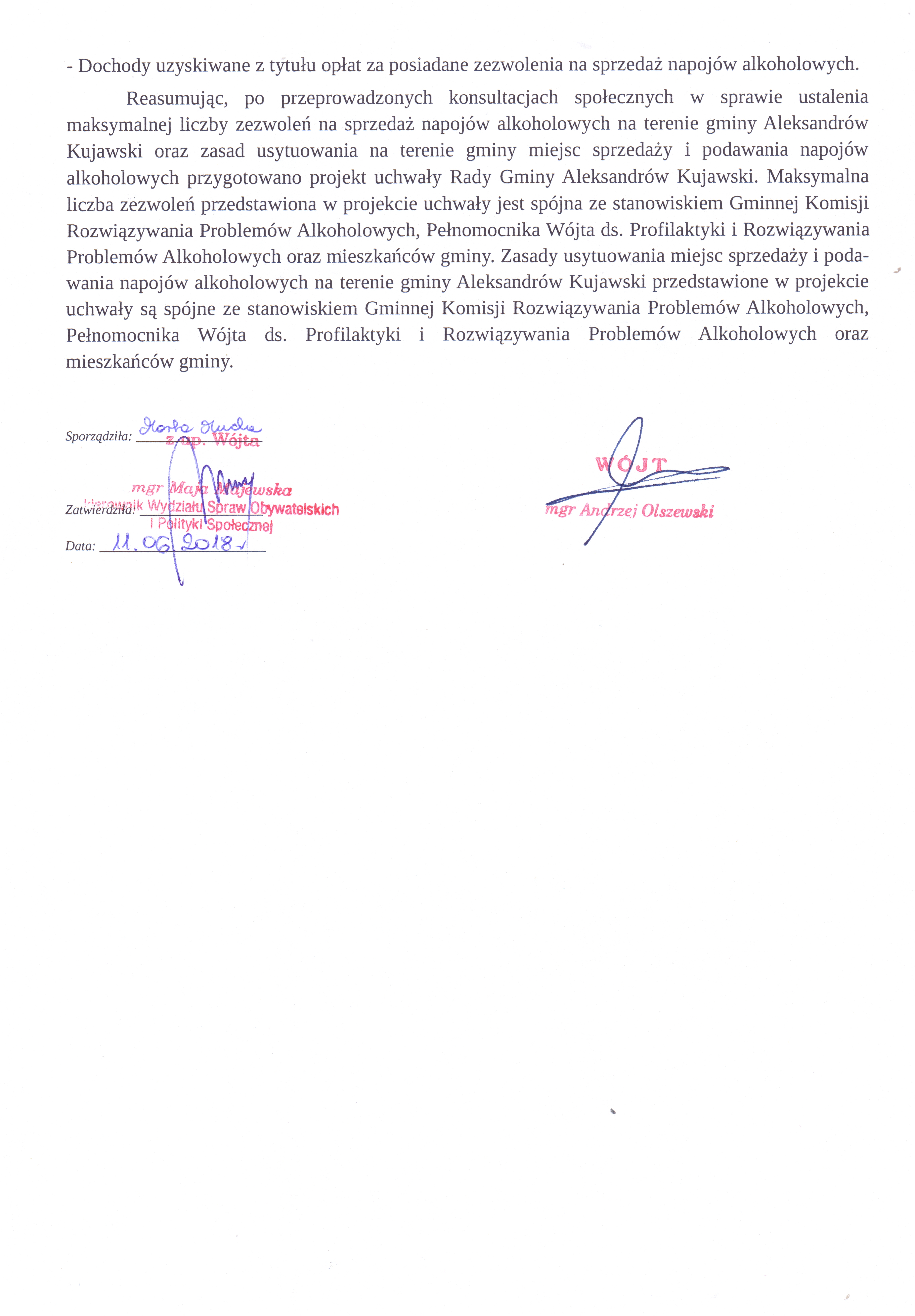 9 marca 2018 roku weszła w życie nowelizacja ustawy o wychowaniu w trzeźwości i przeciwdziałaniu alkoholizmowi oraz ustawa o bezpieczeństwie imprez masowych (Dz.U. 2018 poz. 310). W związku z tym Rada Gminy Aleksandrów Kujawski musi podjąć w terminie sześciu miesięcy od wejścia w życie ustawy, nowe uchwały określające maksymalną liczbę zezwoleń na sprzedaż napojów alkoholowych na terenie gminy Aleksandrów Kujawski z podziałem na poszczególne kategorie alkoholu oraz określić zasady usytuowania na terenie gminy miejsc sprzedaży i podawania napojów alkoholowych.