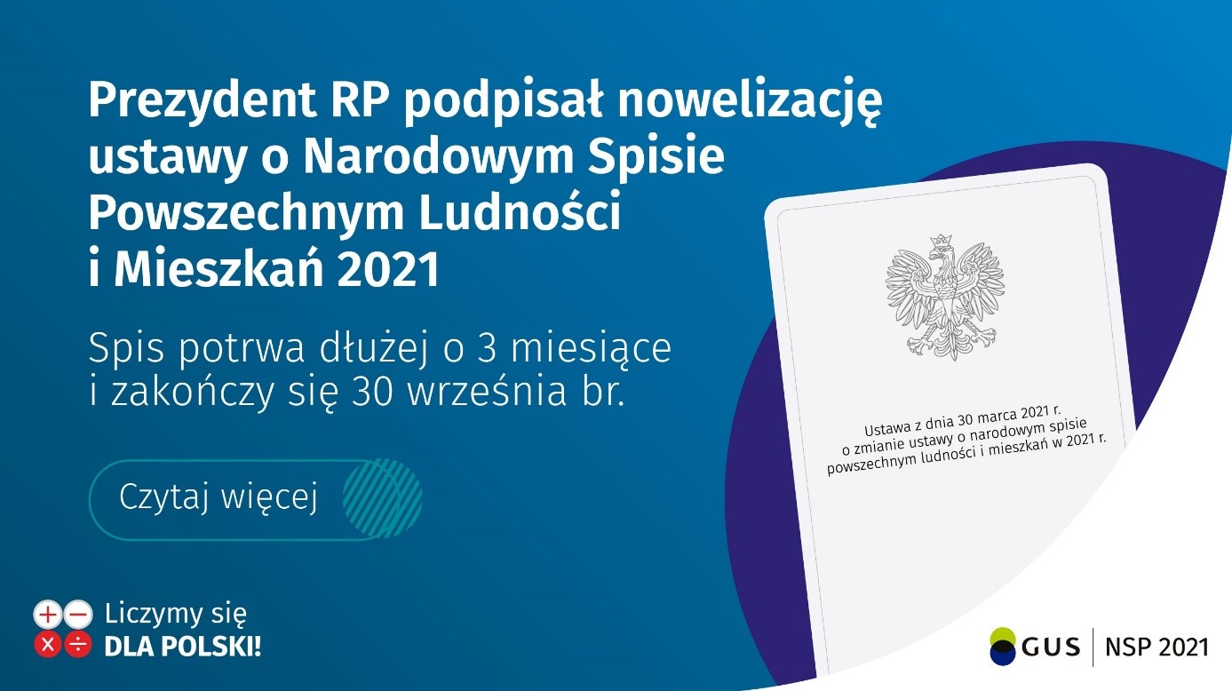 Prezydent Andrzej Duda podpisał 1 kwietnia 2021 r. ustawę z dnia 30 marca 2021 r. o zmianie ustawy o narodowym spisie powszechnym ludności i mieszkań 2021.